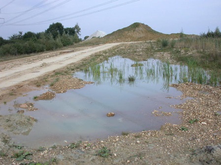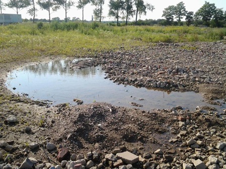 Spontan entstandene Gewässer ohne Kaulquappen im Arbeitsbereich mit grobem Kies auffüllen oder drainieren