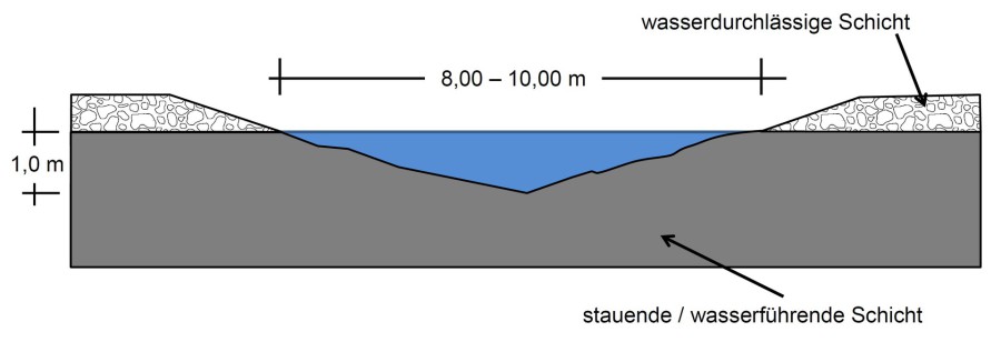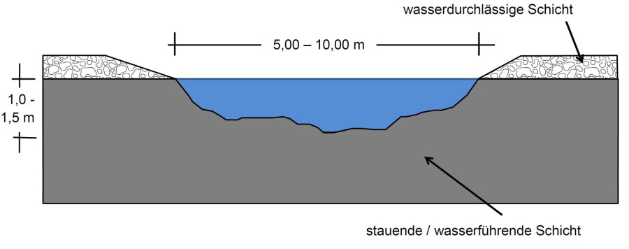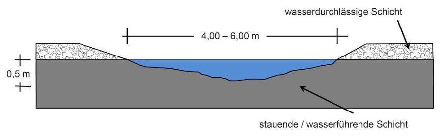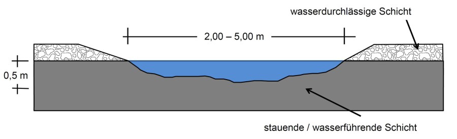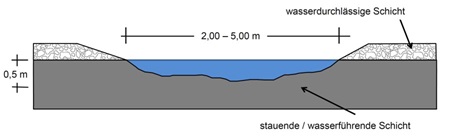 Natürliche Kreuzkrötengewässer sind oft weniger als 20cm flach, da bei künstlich angelegten Gewässern ohne Abdichtung der Wasserstand nicht so sicher ist, sollten die Gewässer an der tiefsten Stelle ca. 50cm tief sein.